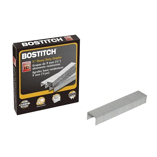 Stanley Bostitch heavy duty staples are made with premium quality steel with extra high carbon content. Designed with chisel point tips for maximum penetration power. Fits all Stanley Bostitch heavy duty staplers and many other brands. 3/8″ leg length. 25 to 55 sheet capacity. 1,000 count box.