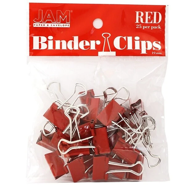 JAM Paper® Red Paper Clips & Blind Clips Office Desk Supply Bundle includes one pack of 100 regular sized paperclips and one bag of 25 small binder clips. Each paperclip is this bundle measures 28 millimeters and are made out of sturdy wire coated in smooth red plastic. The binder clips are made of shiny metal. The bodies of these clips feature a bold red color while the handles are a grey steel color. Each of these clips measures 19 millimeters. This bundle is excellent for organizing documents, memos, notes, and other papers in your office or work space! These items will help your organized papers to stand out with their bold red color.