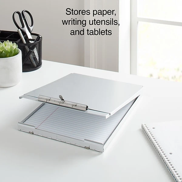 Carry and fill out documents with this storage clipboard. The flip-up plate opens to reveal the paperwork stored inside for easy access. Two compartments let you separate blank paper and completed documents, while the low-profile clip holds pages securely in place. Crafted from durable aluminum, this Staples silver clipboard is ideal for use in a range of commercial and industrial settings.