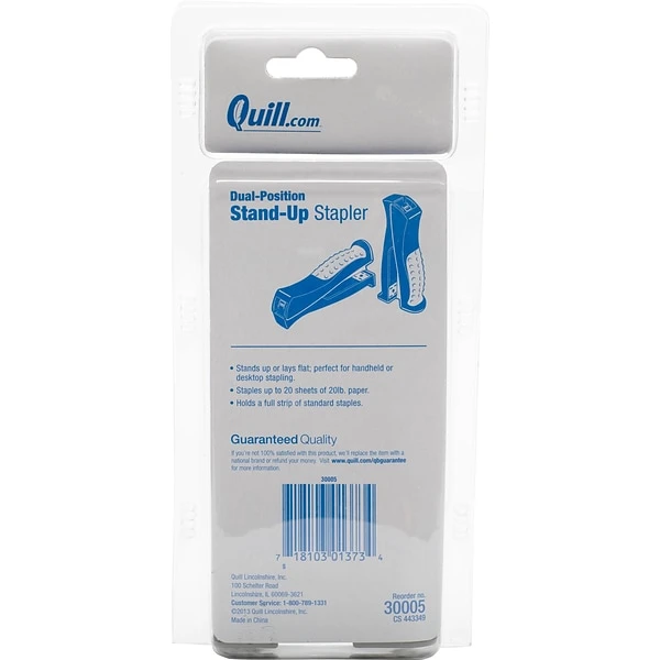 The Stand up stapler requires 60 percent less effort than traditional desktop staplers. Stapler has durable metal construction with plastic base and handle.