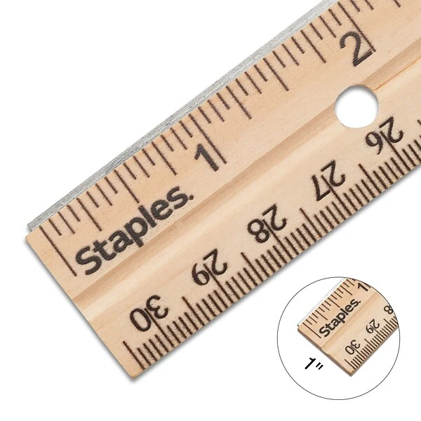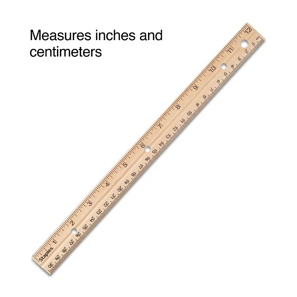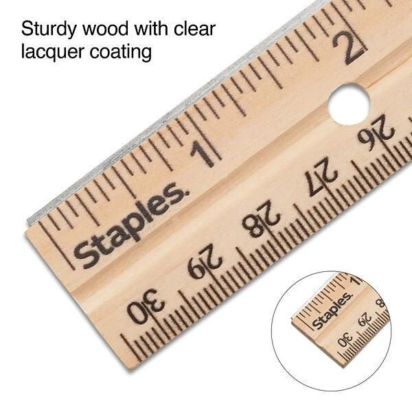 The Staples 12″ wooden ruler is hole punched, is imperial and metric, and is treated with a clear lacquer finish.