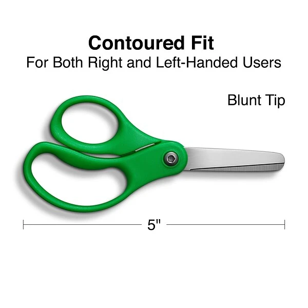 These Staples 5-inch blunt-tip scissors are ergonomically designed to suit ambidextrous use. The blunt-tip blades and comfortable kid’s handle add safety and security for little hands. Stainless steel coated blades provide ruggedness and durability, perfect for a variety of materials.
