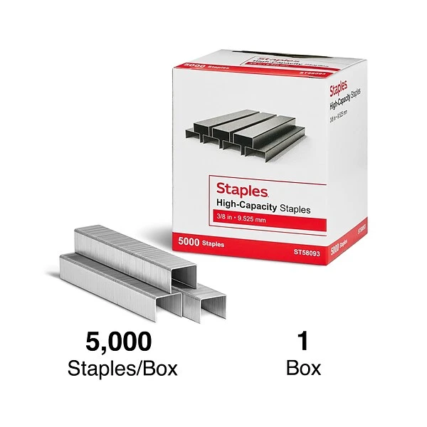 Bind loose pages of documents together with these high-capacity staples. The longer legs effectively puncture and clamp large stacks of paper, while the galvanized wire coating and ample wire thickness deliver reliable strength and durability. Refill multiple stapler units in your office with this convenient 5000-count box of half-strip staples. These Staples High-Capacity heavy-duty staples have standard tips that can be easily pried out with a flat-type staple remover for a hassle-free workflow.