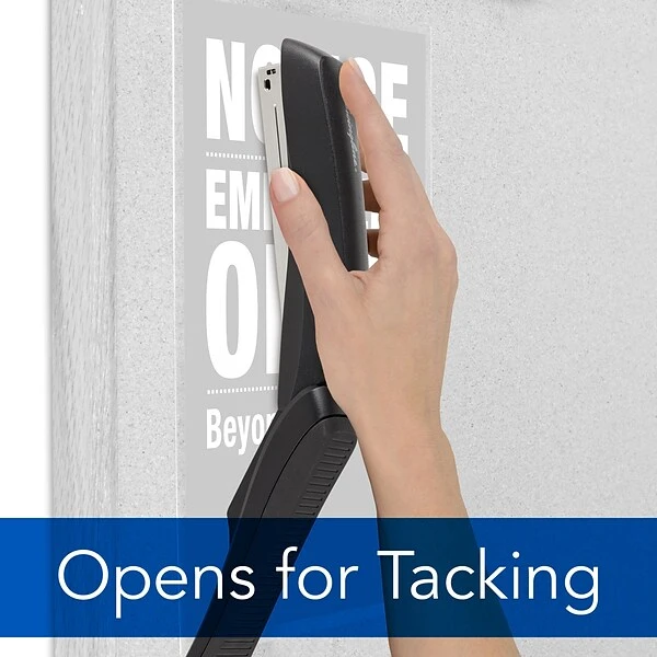 Stapler includes a tacking function. Simply pull up on the top to open and switch to tacking position so you can post papers to bulletin boards, telephone poles and more.
