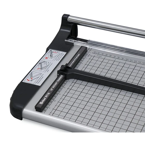 United’s RT18 rotary paper trimmer is designed for accuracy, durability and safety. The self-sharpening rotary blade cuts in both directions and is safely housed in an ergonomic cutting head to comfortably keep hands away from the blade. The full length paper clamp automatically engages as the blade passes by for accurate cuts every time. The RT18 paper cutter is constructed with a rugged steel base that won’t warp or crack, standard/metric alignment grid and a locking side guide for precise alignment. The United RT18 cuts stacks up to 1/16″ and up to 15 sheets of paper at a time. United paper cutters and trimmers are backed by a 6 month no hassle replacement warranty.